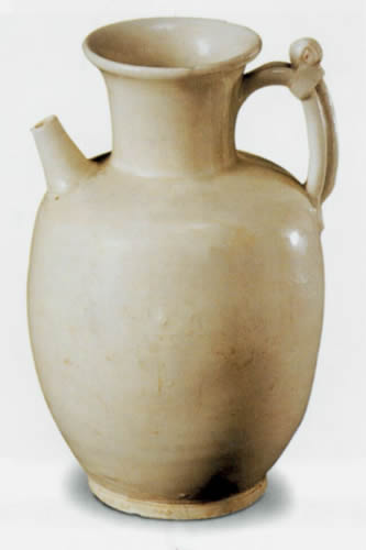 白瓷首創(chuàng)于隋代,成熟于唐代,唐人曾稱頌當(dāng)時(shí)制造的白瓷說(shuō):“大邑?zé)奢p且堅(jiān),好似美玉天下傳。君家白碗盛霜雪,急送茅齋也可憐。”唐時(shí)白瓷的制作工藝可謂高超之極。然而,這件白瓷執(zhí)壺雖也精致非常,但與美玉相比似乎還差得很遠(yuǎn),可能是唐代平民所用之器,并非唐時(shí)白瓷燒造的最佳水平。